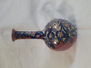青味がかったピンク地にピンクがかった青で描かれたザクロ模様の一輪挿し。